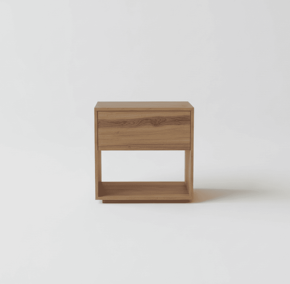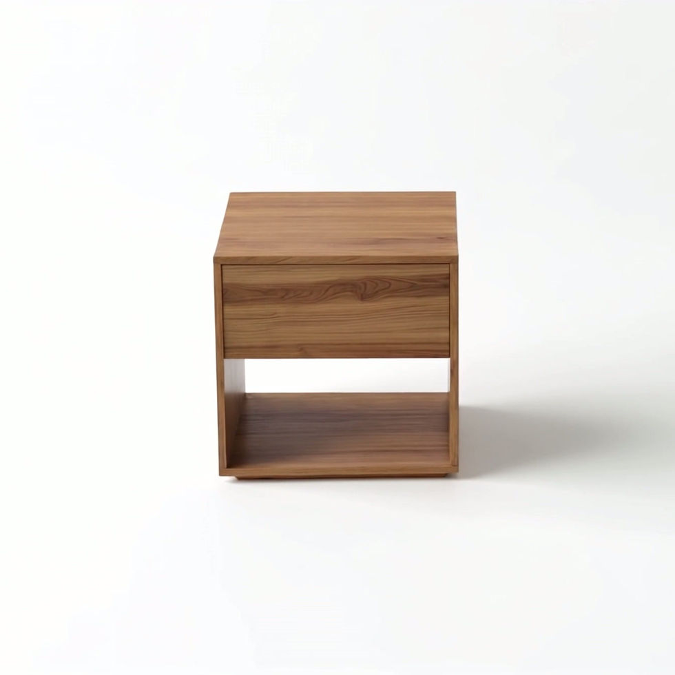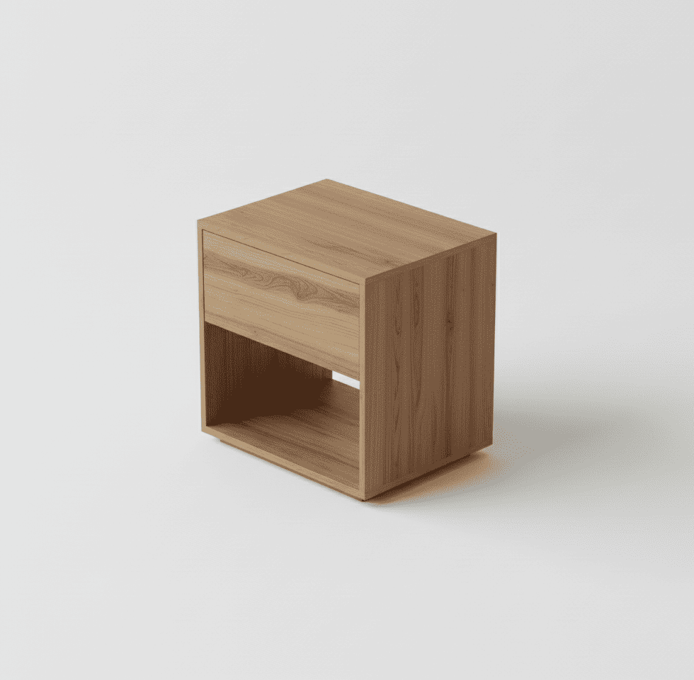 Velador compacto con proporciones precisas. Cuenta con un cajón superior y una base abierta para almacenamiento adicional. Diseño sencillo y elegante con énfasis en funcionalidad. Ideal para ser colocado junto a una cama, ofreciendo almacenamiento práctico y accesible.