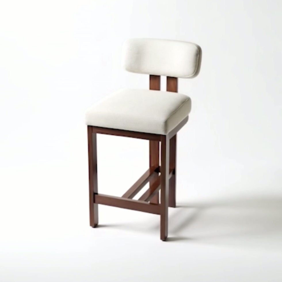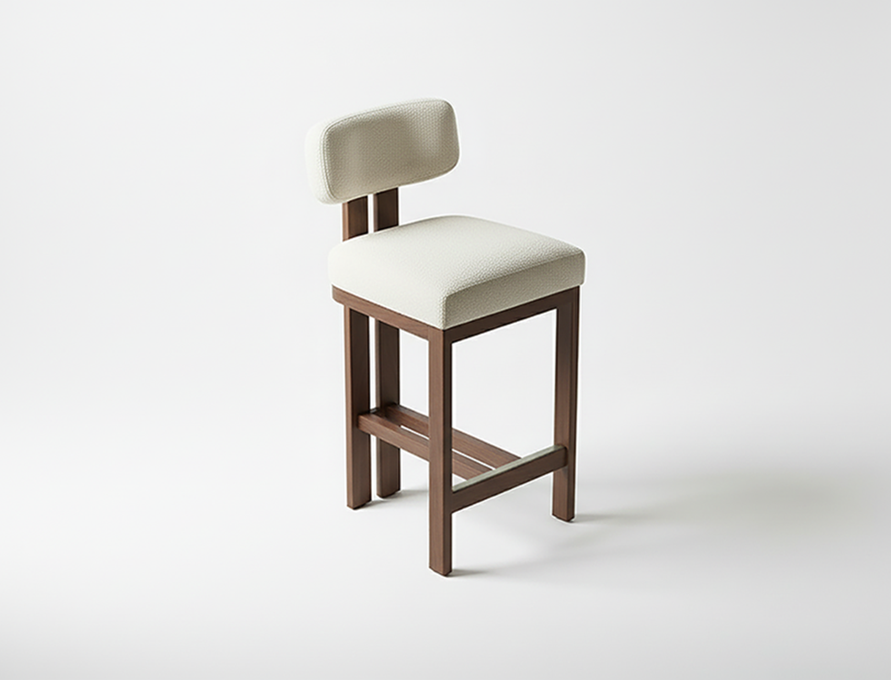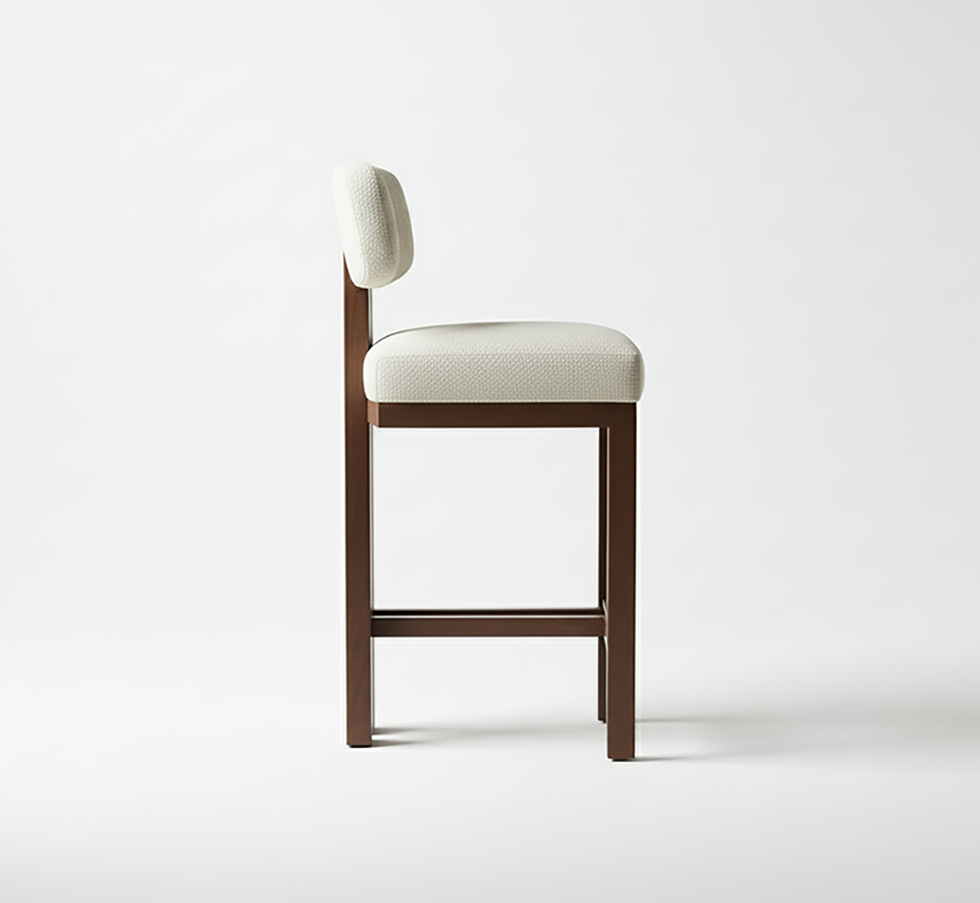 Taburete con respaldo bajo y acabado en tono oscuro. Su estructura compacta y tapizado suave lo convierten en un acento elegante. Confort ergonómico en respaldo y asiento acolchado, ideal para barras, cocinas abiertas o espacios sociales de alto diseño.