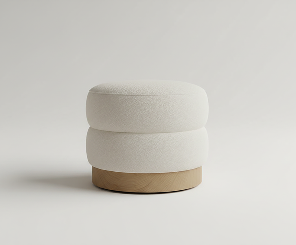 Ottoman de silueta redonda y compacta con estética escultórica. Diseño que combina comodidad, armonía y ligereza visual Ideal como asiento auxiliar o pieza decorativa.