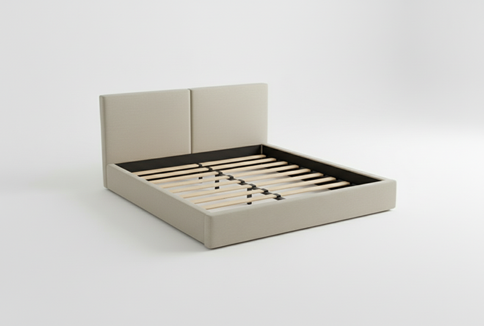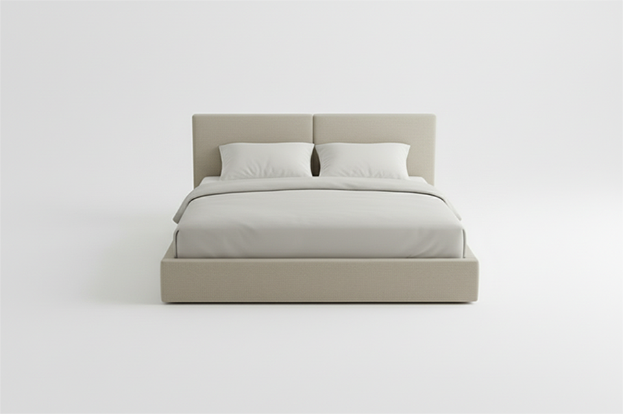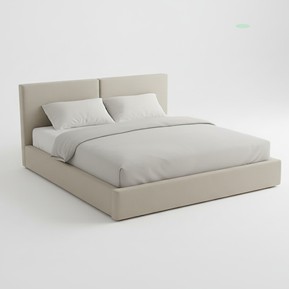 Cama de líneas arquitectónicas y cabecero plano. Diseño minimalista con énfasis en la suavidad visual y el confort Estructura tapizada que ofrece una estética envolvente. Perfecta para dormitorios modernos y espacios relajantes.